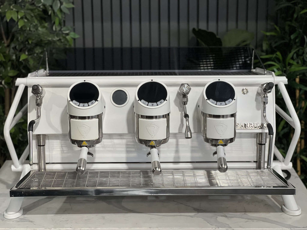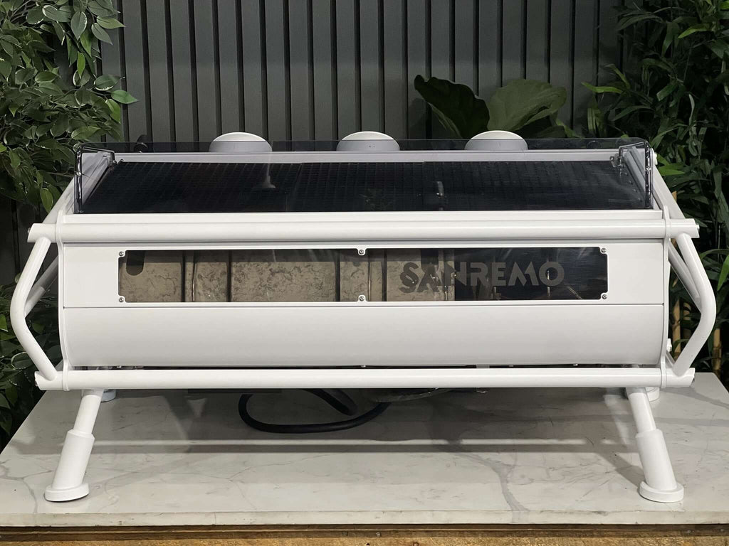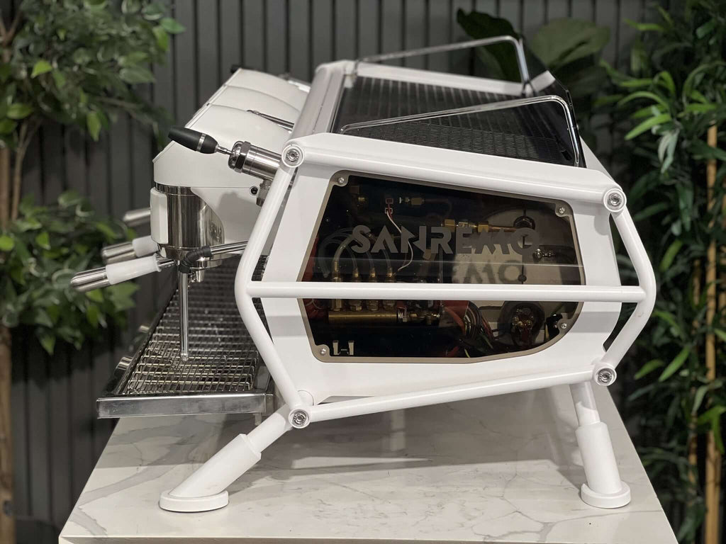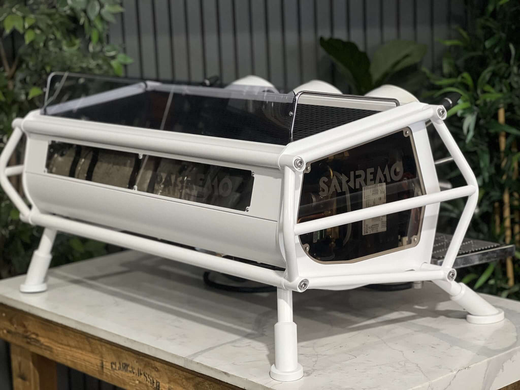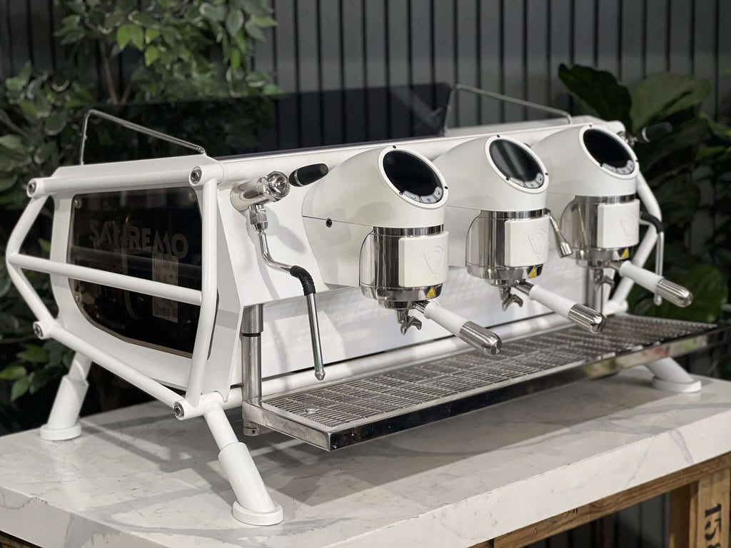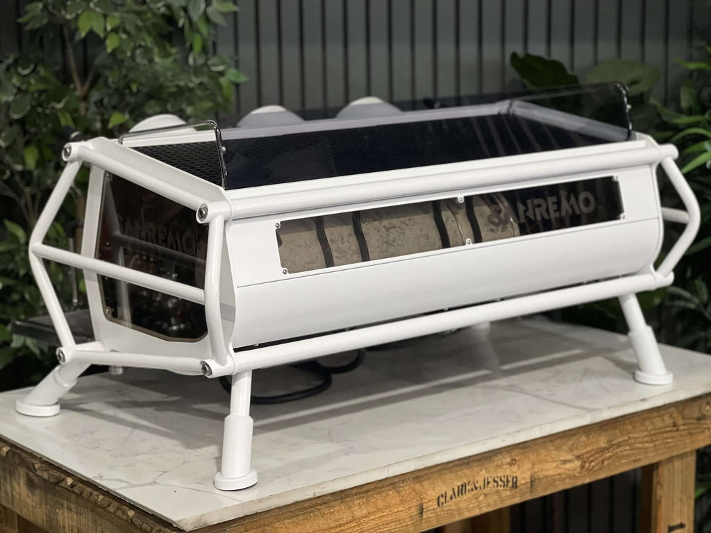 San Remo Cafe Racer 3 Group Coffee Machine White/Naked w/ White & Silver Pesado Handles